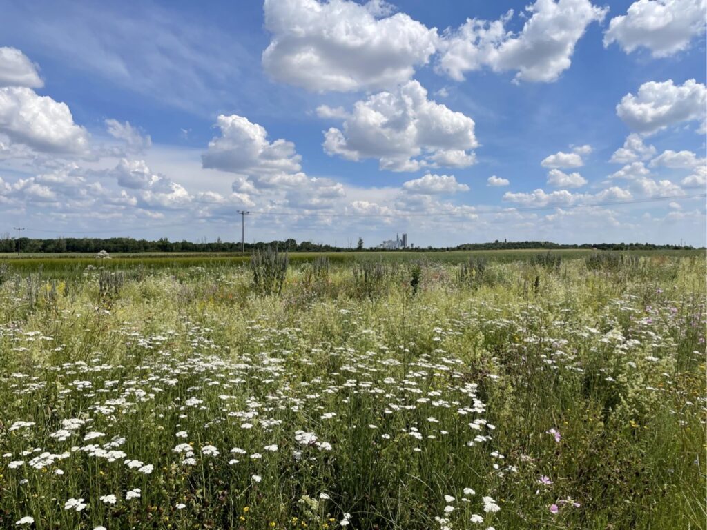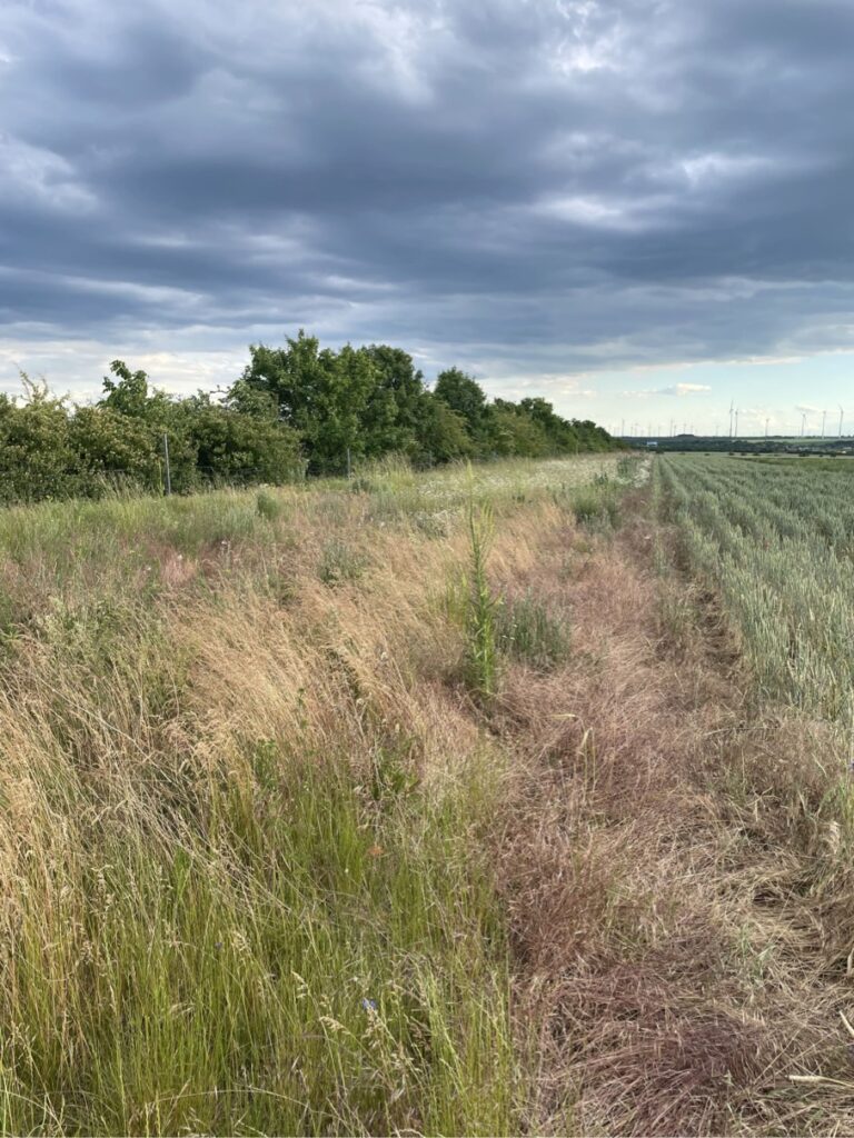 Mehrjährige Wildpflanzen-Blühstreifen sind eine sehr wirksame Maßnahme, die zur Förderung bedrohter Feldvogelarten und Wildbienenarten in der Agrarlandschaft beitragen. Ein Blühstreifen-Anteil von 6-10 % an den Ackerschlägen ist geeignet, um eine signifikante Erhöhung der Arten- und Revierzahl typischer Feldvögel, insbesondere bei einer Anlage in offenen Landschaften, zu erzielen. Sandwege, alte Kiesgruben und Steilwände dienen u.a. Wildbienen als Nisthabitat, sodass eine Anlage von Blühstreifen in der Nähe dieser eine optimale Nahrungsquelle für die Wildbienen darstellt. Durch die Verwendung von gebietseigenen Wildkräuter-Mischungen wird ein breites Nahrungsspektrum für verschiedene Insektengruppen, Wildbienen, Schmetterlinge, Schwebfliegen, bereitgestellt.